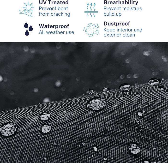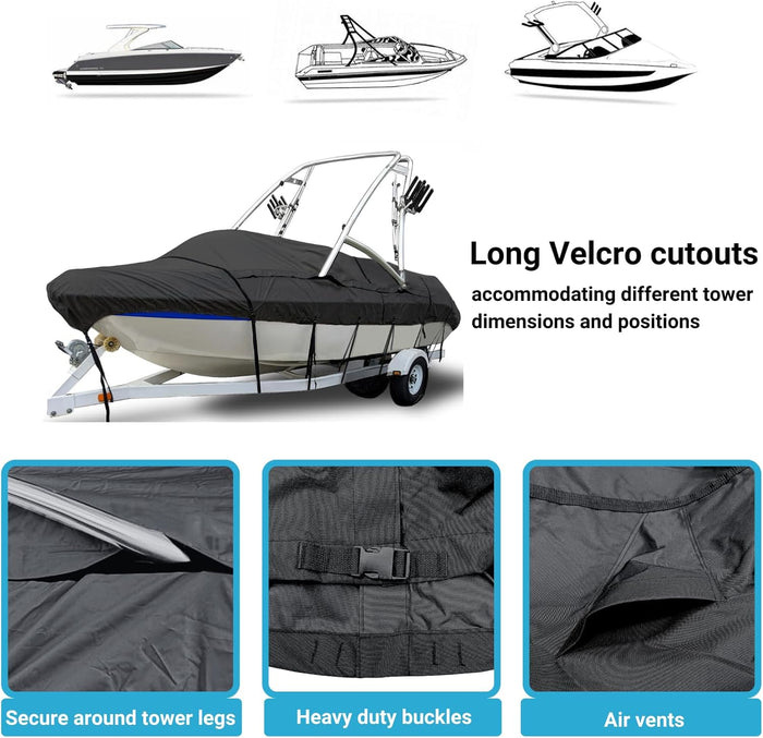 SavvyCraft's Supreme Boat Cover is designed for tournament boats with Ski & Wakeboard Towers. Made from durable 900D marine-grade polyester with UV treatment, it provides superior protection against sun, rain, snow, and dirt. The breathable fabric prevents moisture buildup, while reinforced seams and Velcro cutouts ensure a secure fit. Includes heavy-duty straps, buckles, and a mesh storage bag for easy transport and storage.