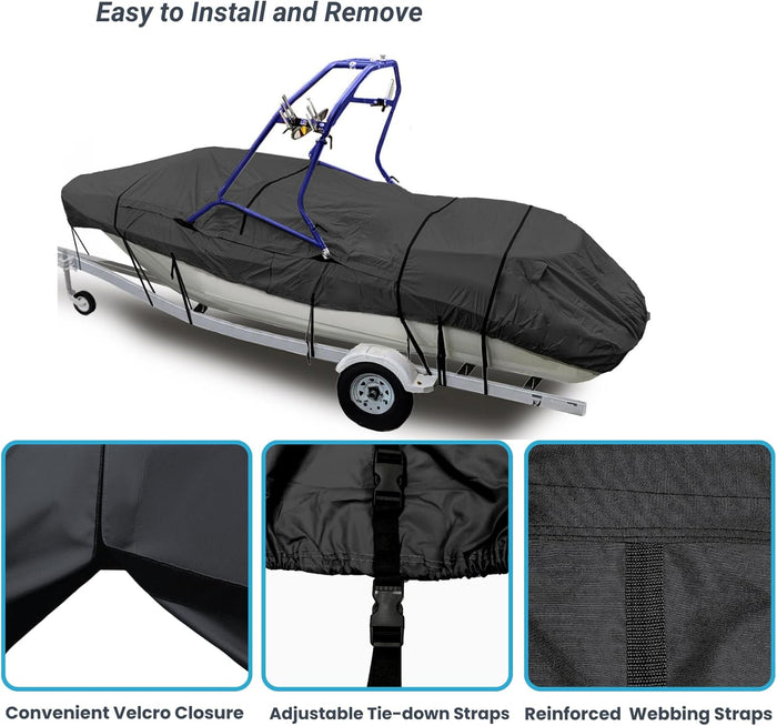 Savvycraft 900D Ski & Wakeboard Tower Boat Covers Fits V-Hull Runabout with Ski/Wakeboard Towers - Black / 17'-19'L/ beam width to 102" W is backordered and will ship as soon as it is back in stock.