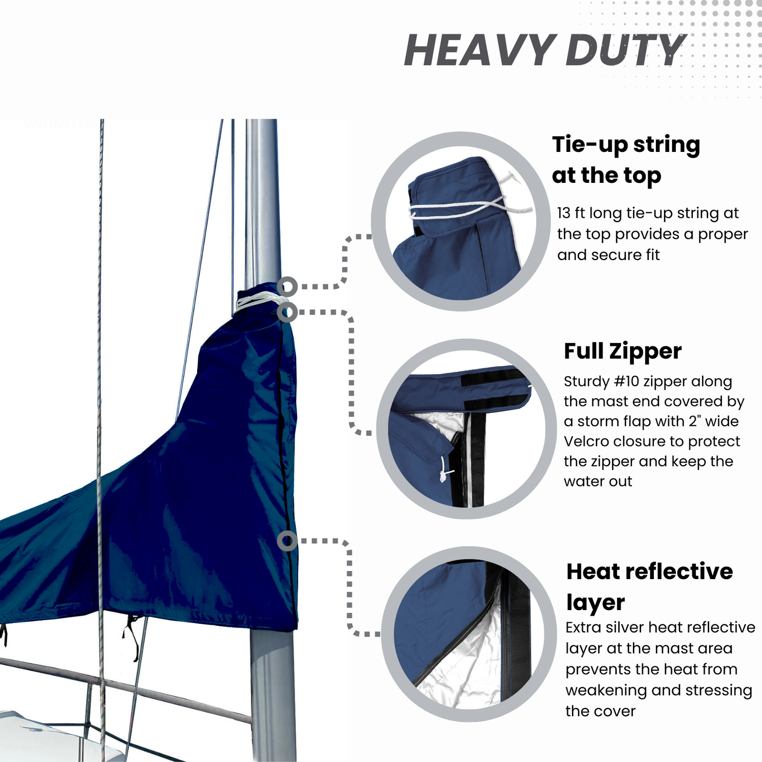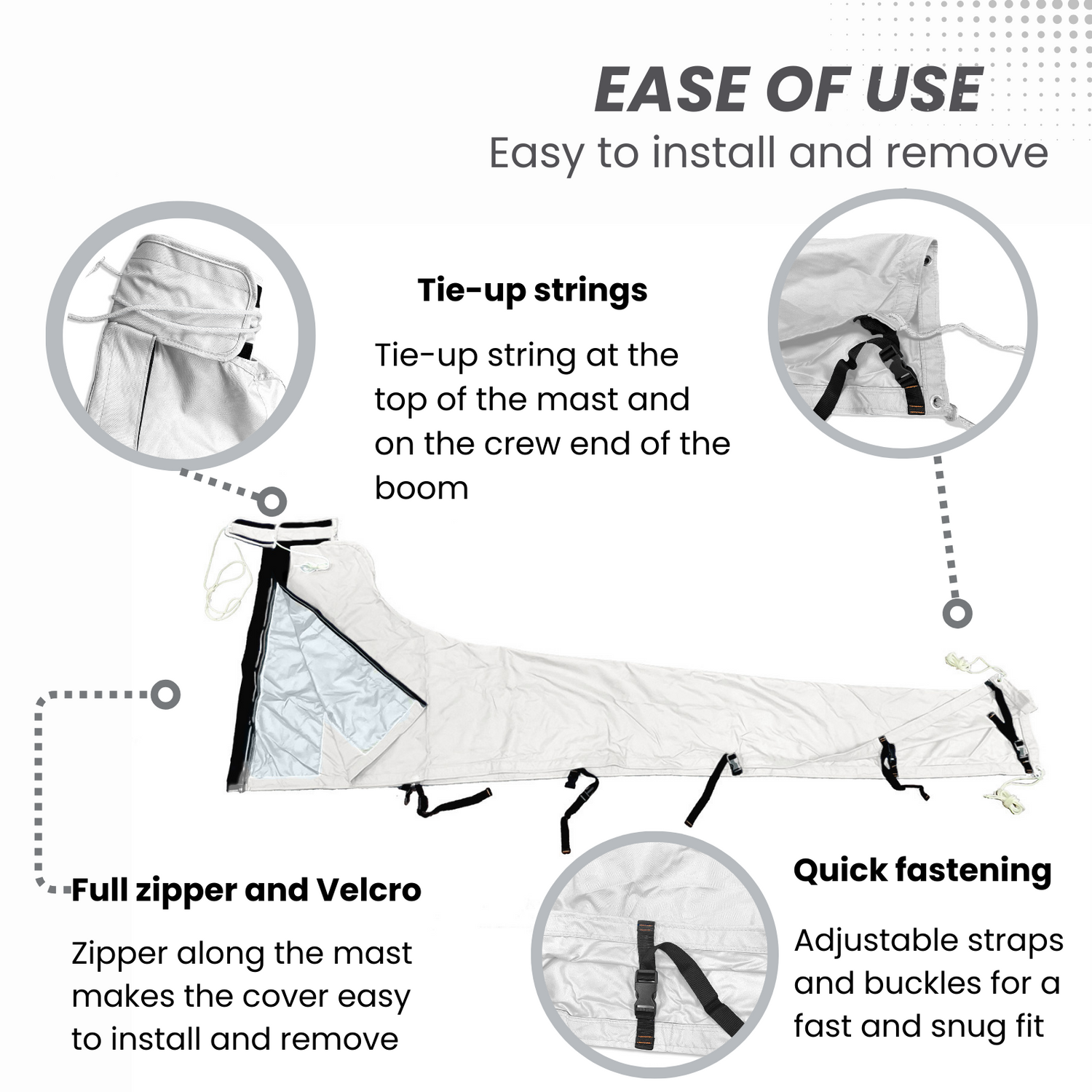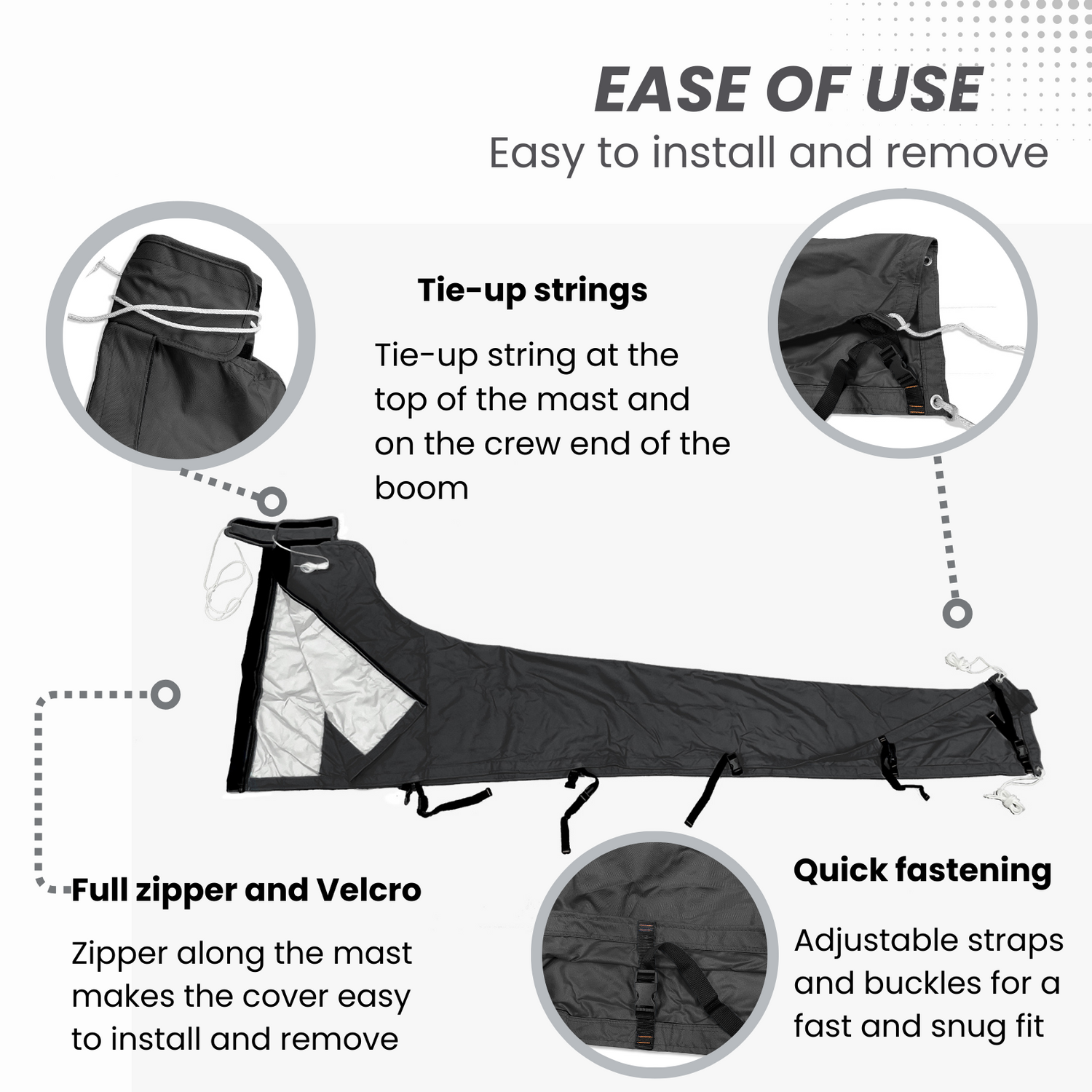 Heavy duty #10 zipper along the mast end with a tie-up string at the top, covered by a storm flap with 2" wide Velcro closure to protect the zipper and keep the water out; Adjustable webbing tie-down straps with built-in buckles along the bottom edge of the boom for a proper fit and neat appearance